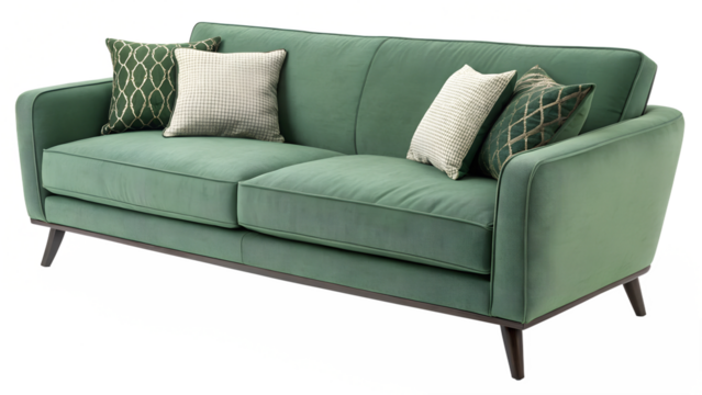 Modern green velvet sofa isolated on transparent background, stylish furniture