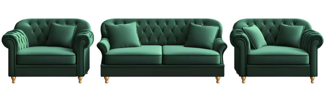 Isolated elegant green velvet Chesterfield two seater sofa classic furniture for modern home interior design comfort and style