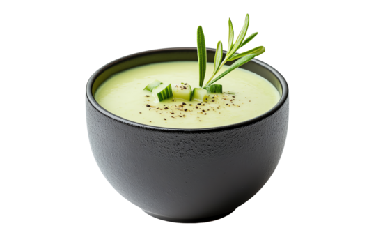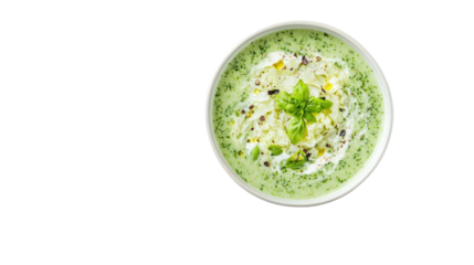 Food photography of delicious green soup bowls with fresh ingredients on transparent background