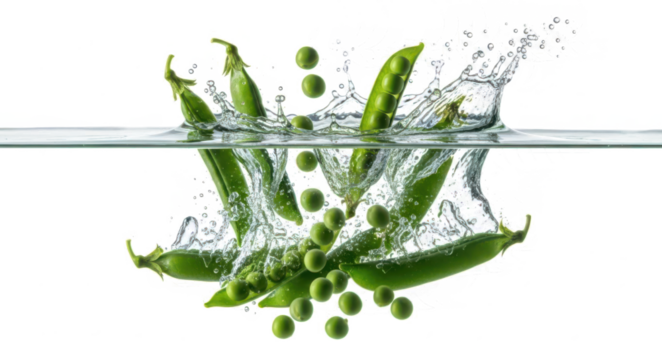 Fresh green peas splashing into clear water revealing ripe pods and small spherical seeds in dynamic motion water splash vegetable healthy ingredient food macro falling transparent background