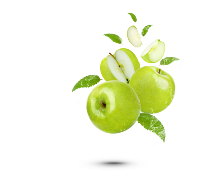 Water splash on fresh green apple with leaves isolated on transparent background. (.PNG)