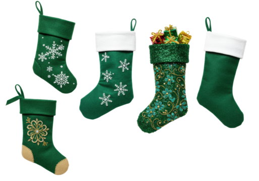Six distinct green and white Christmas stockings, unique festive designs, elegantly arranged on a transparent background with copy space, festive holiday promotion