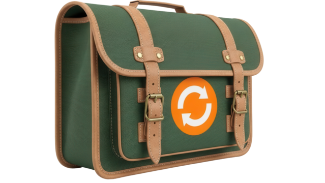 Isolated vintage green canvas satchel with tan leather straps and retro circular symbol