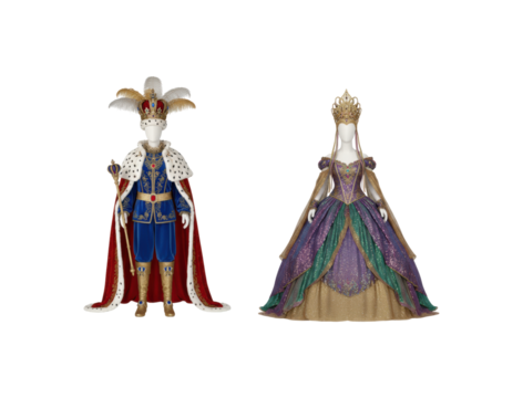 Two royal king and queen costumes on mannequins feature a blue velvet suit with a red ermine cape and a sparkling purple and green gown with ornate gold crowns for a theatrical display