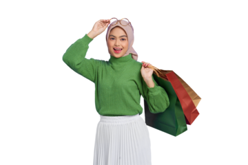 Cheerful beautiful Asian woman in green sweater pointing finger at shopping bag isolated on transparent background