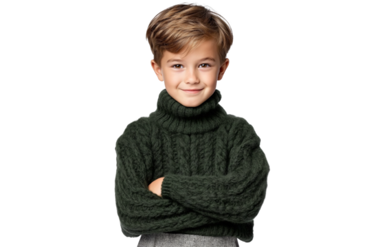 Studio portrait of a charming young boy with a warm smile in a cozy green sweater, arms crossed, isolated on white background