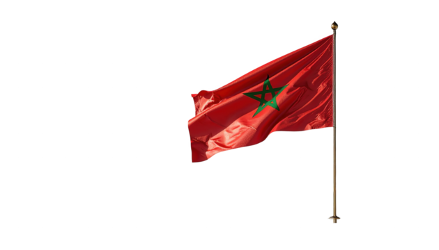 Bright red flag featuring a prominent green symbol in the center, gently waving in the wind, is displayed against a dark backdrop.
