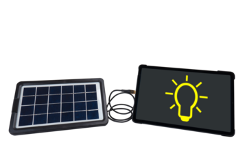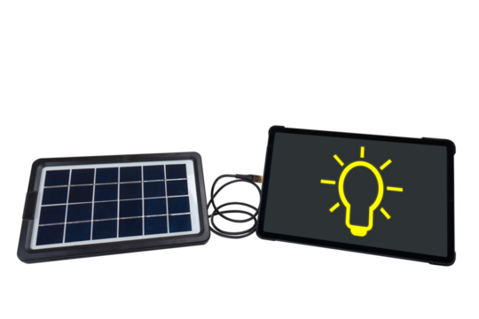 Portable solar panel connected to tablet PC on transparent background (close-up). The tablet PC screen displays an icon in the form of a light bulb. Renewable green alternative energy concept