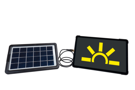 Portable solar panel connected to tablet PC on transparent background (close-up). On the tablet PC screen is an icon representing the sun. Renewable green alternative energy concept