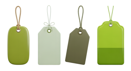 Four light green paper tags with brown string isolated PNG, gift tags for scrapbooking and crafting projects on transparent background