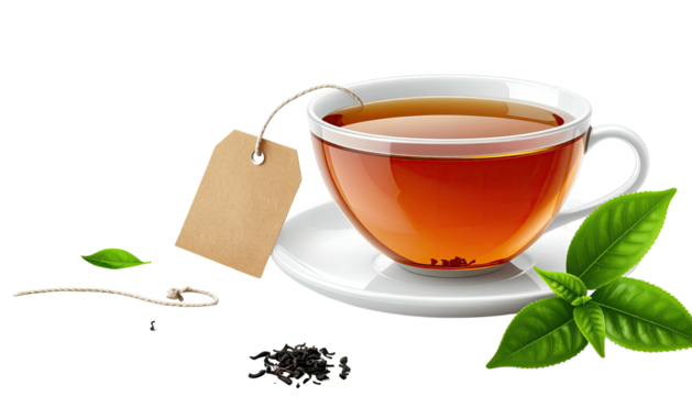 Steaming cup of tea with tag, saucer, herbs, and tea leaves on black