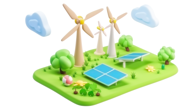 Cartoon illustration of a green energy scene. It features toy-like wind turbines and solar panels set on a grassy landscape with trees, clouds, and a flower.