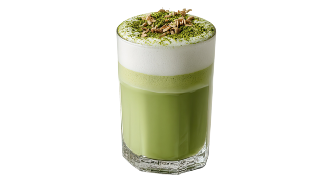 Matcha latte in glass with creamy green texture showcasing refreshing beverage made from powdered tea and milk combination isolated on white background