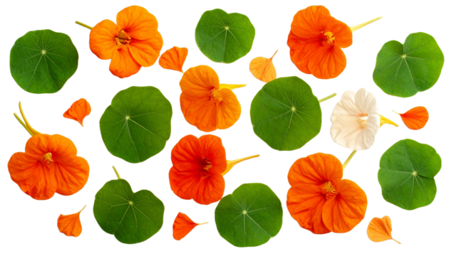 Blossoms Scattered Nasturtium Leaves with Beautiful Texture, Isolated on Transparent Background