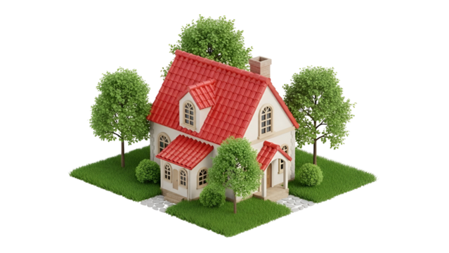 3 D Rendered House with Red Roof and Green Trees on Grass