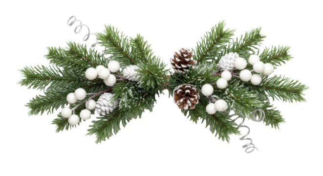 Artificial Christmas sprig with glistening berries, deep green needles, sparkling snow, frosted pinecones, silver filaments, on transparent background, elegant winter holiday decoration concept.