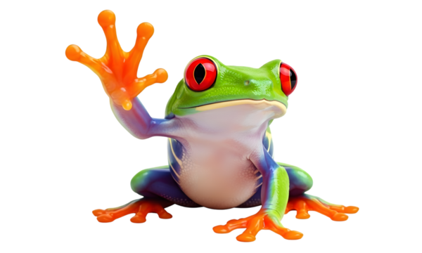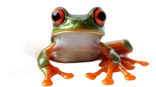 Red-eyed tree frog with red eyes, vibrant green skin, and orange toes on a transparent background