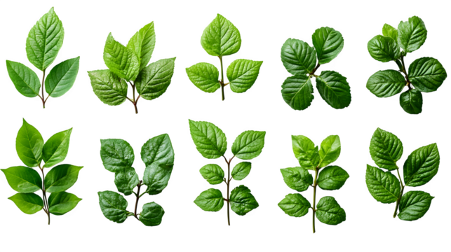 Set of green twigs with fresh leaves, various shapes, isolated on transparent