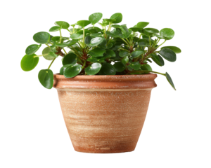 Vibrant green Pilea peperomioides plant in terracotta pot conveys freshness. This beautiful houseplant object, straight on photo isolated on transparency background