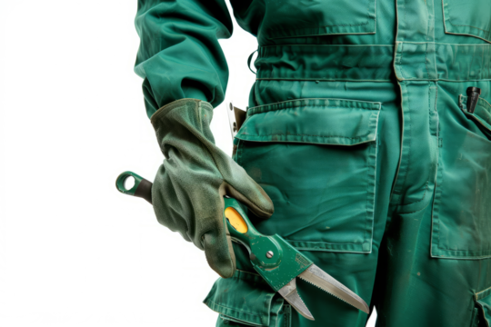 A gardener in a green uniform, holding pruning shears and a trowel, white background.