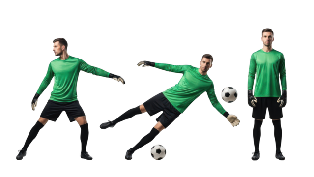 Goalkeeper mid air catching soccer ball in green uniform isolated on transparent background