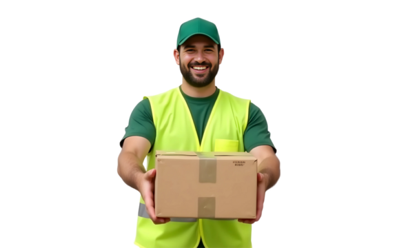 Delivery man in green uniform handing over a package, isolated on transparent background