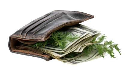 Dark leather wallet filled with US dollars and greenery