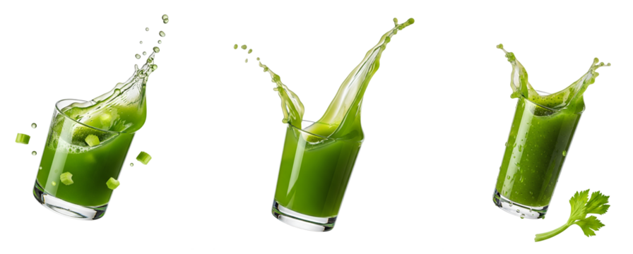 Fresh Celery Juice Glass Set PNG. Collection of green vegetable smoothie drinks with splashing liquid. Healthy organic detox beverage for diet and weight loss. Vitamin cleanse kit isolated