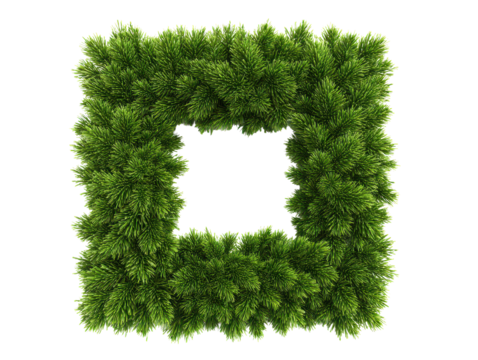 Square green wreath frame made of lush pine branches with an empty center isolated on transparent background.