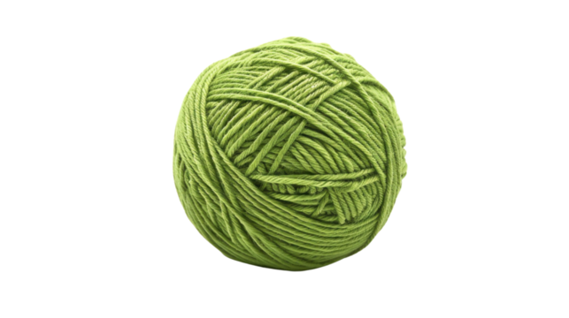 A single ball of bright green yarn sits against a transparent checkered background in a studio shot