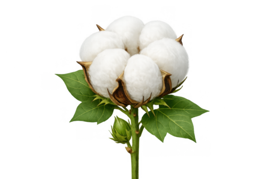 Cotton plant branch displaying natural fiber bolls with green leaves and water drops, transparent background