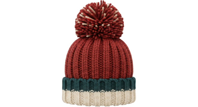 Green knit beanies with pom poms, various styles, isolated on transparent background
