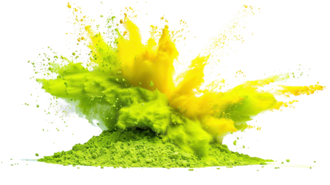 Bright yellow green holi paint color powder festival explosion on white transparent background