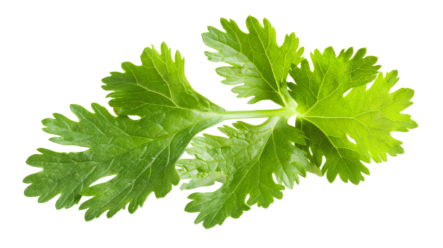 A sprig of fresh green cilantro, also known as coriander leaves, isolated on a white background, commonly used as a culinary herb or garnish.