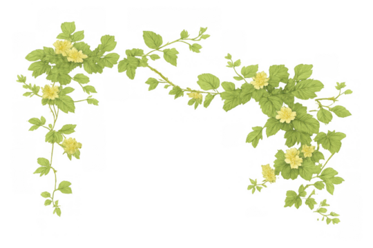 Green vine with yellow flowers creating a decorative floral border on transparent background, botanical design element