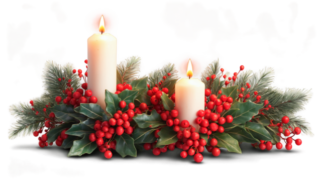 Festive green wreath with red and white berries on transparent background