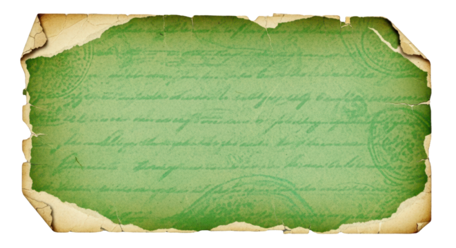 vintage greenish torn paper scrap with faded ink texture, aged and stained look, transparent background