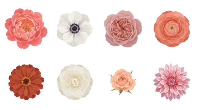 Floral bloom set including peony, anemone, rose, ranunculus, zinnia, and dahlia varieties isolated. Botanical illustration collection for wedding and greeting card design.