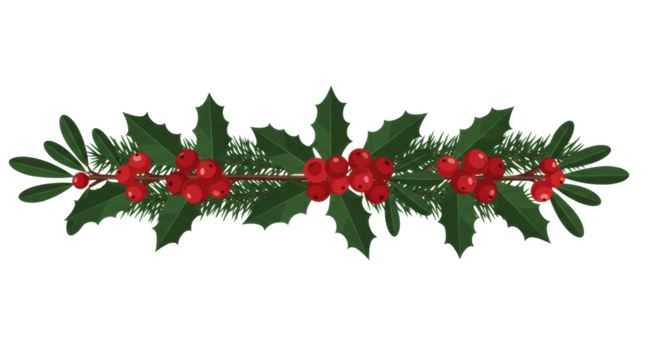 A decorative christmas garland made of holly leaves and red berries, isolated on a transparent background