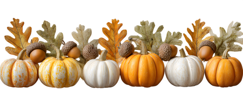 Elegant autumn harvest display with pumpkins, acorns, and fall leaves, perfect for Thanksgiving table decor and seasonal greetings