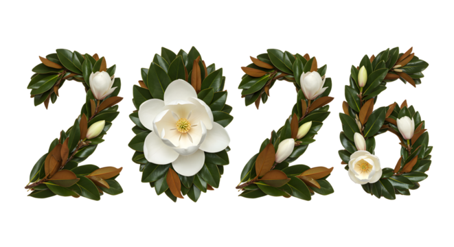 2026 numbers made of magnolia flowers and green leaves, floral nature concept, perfect for New Year and seasonal greetings