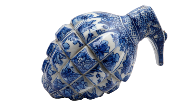 Blue and white porcelain grenade representing fragile art and unexpected violence with ornate floral patterns