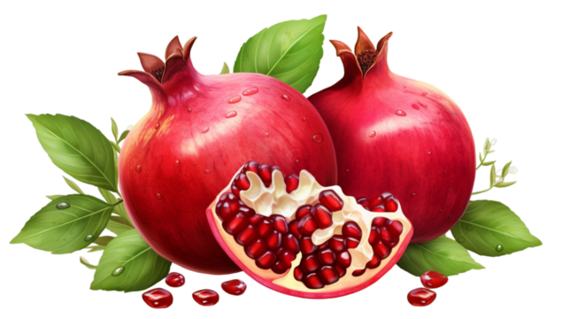 Whole and Halved Pomegranate with Green Leaves on White Background isolated on a transparent background