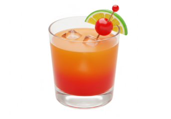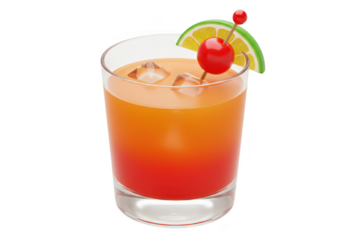 Colorful tequila sunrise cocktail with cherry and lime isolated on transparent background