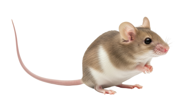 Isolated house mouse with pink tail, whiskers, brown fur and white belly indoors