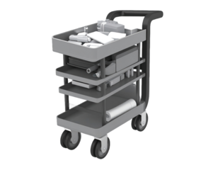 Monochrome Utility Cart With Multiple Shelves and Wheels Carrying Various Objects