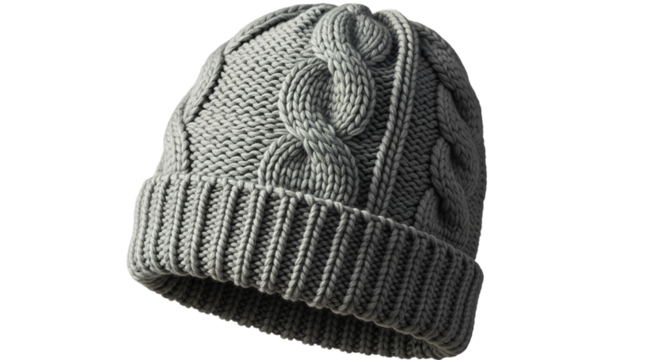 Stylish gray knit beanie hat for winter fashion accessory and warmth close up shot on transparent background