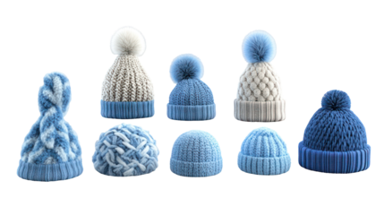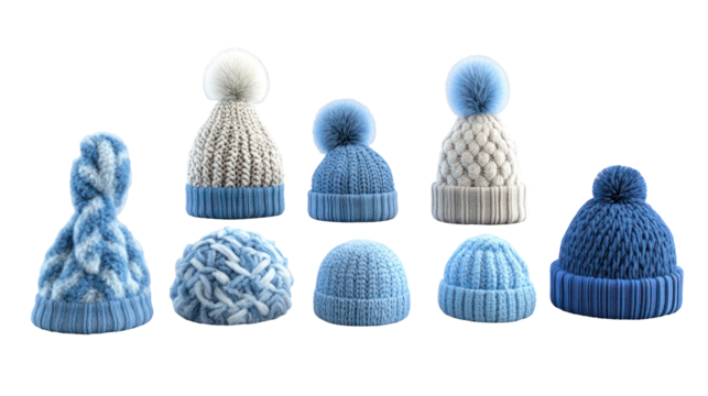 A grey knitted winter beanie with a fluffy pompom is displayed against a clean transparent background showcasing its cozy texture and stylish design