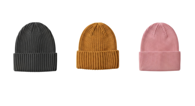 A dark gray knitted beanie hat with a folded brim, presented isolated on a transparent background, perfect for cold weather fashion