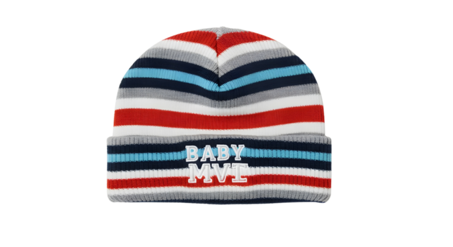 Striped beanie hat with "BABY MVE" text isolated PNG with Transparent Background